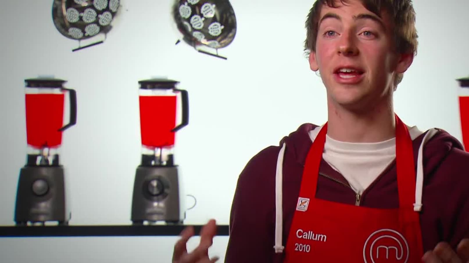 Each memberof the winning year team standsin front of their individualknife blockthat contains 3 knives in it. Written on each knife is one of their personal nightmare dishes from their MasterChef experience.