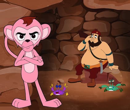 The monkey feeds the pirate pickles until he passes out and sends him out to sea tied to a raft.