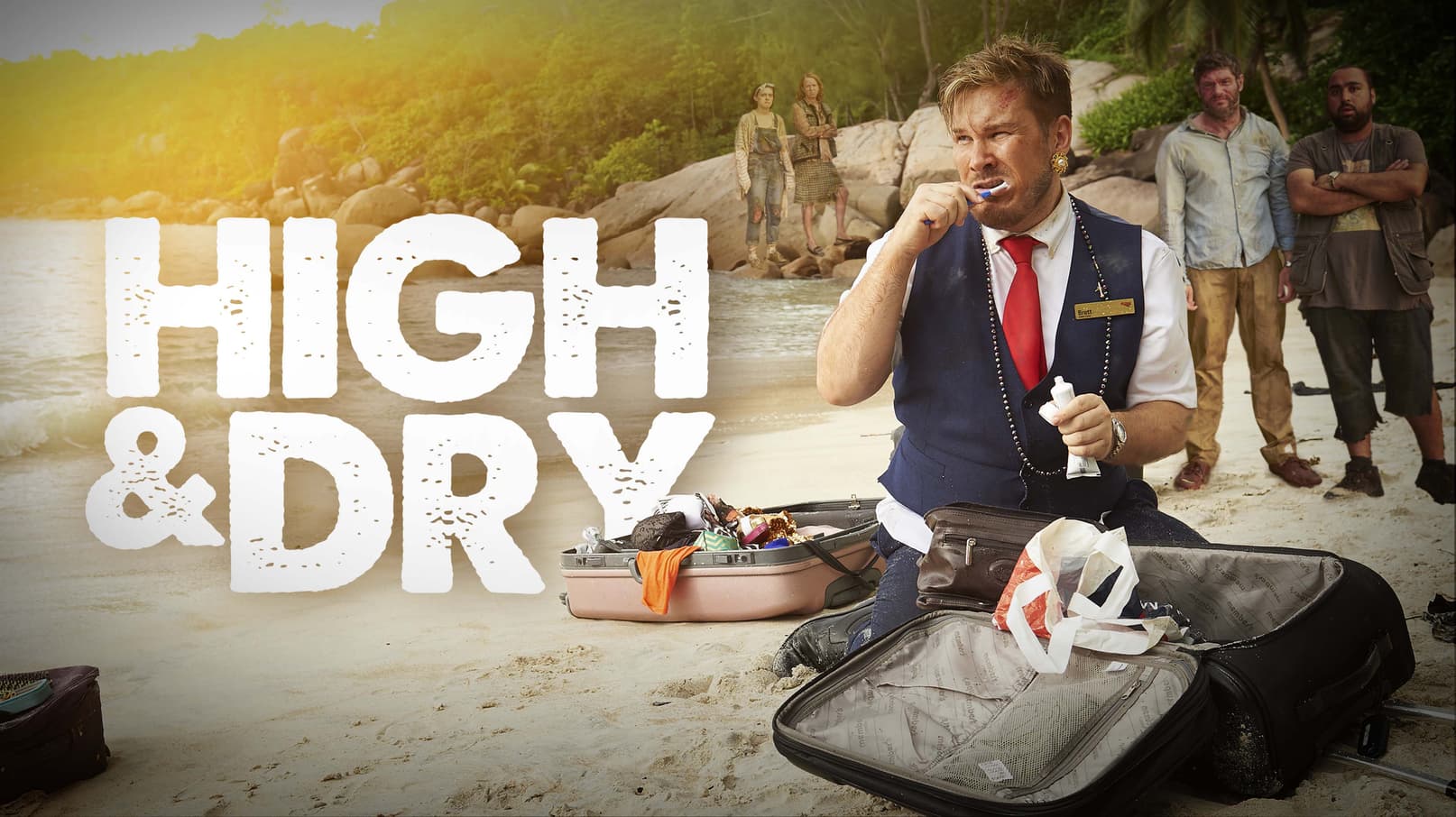 Paradise turns to hell in this castaway comedy series written by and starring Marc Wootton. High And Dry centres around survivors of a plane crash who have washed up on a remote island in the Pacific. Led by overbearing, sociopath air steward Brett Sullivan, also self-proclaimed "King of the Island", the survivors assemble together in the belief they are each other's best chance of survival, or so they think... will people show their true colours when survival instincts kick in and will they ever stand a chance of being rescued?