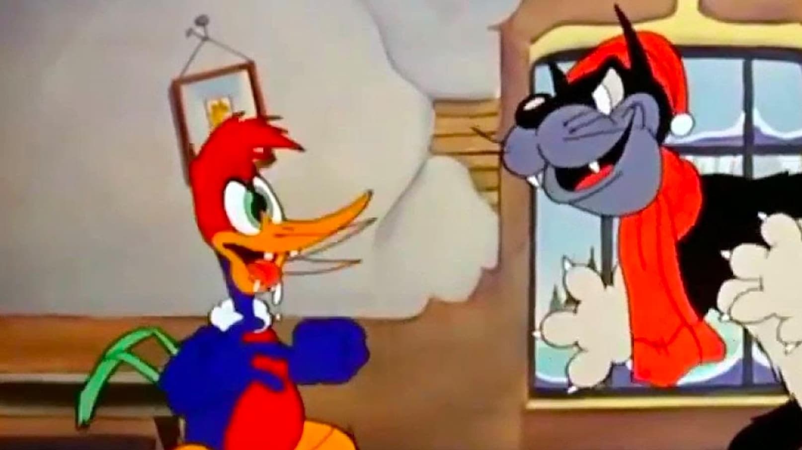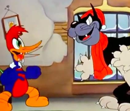 Woody stays behind to swim while the other birds migrate south for winter. Just after the other birds leave, the cold of winter sets in instantly and Woody's swimming hole freezes