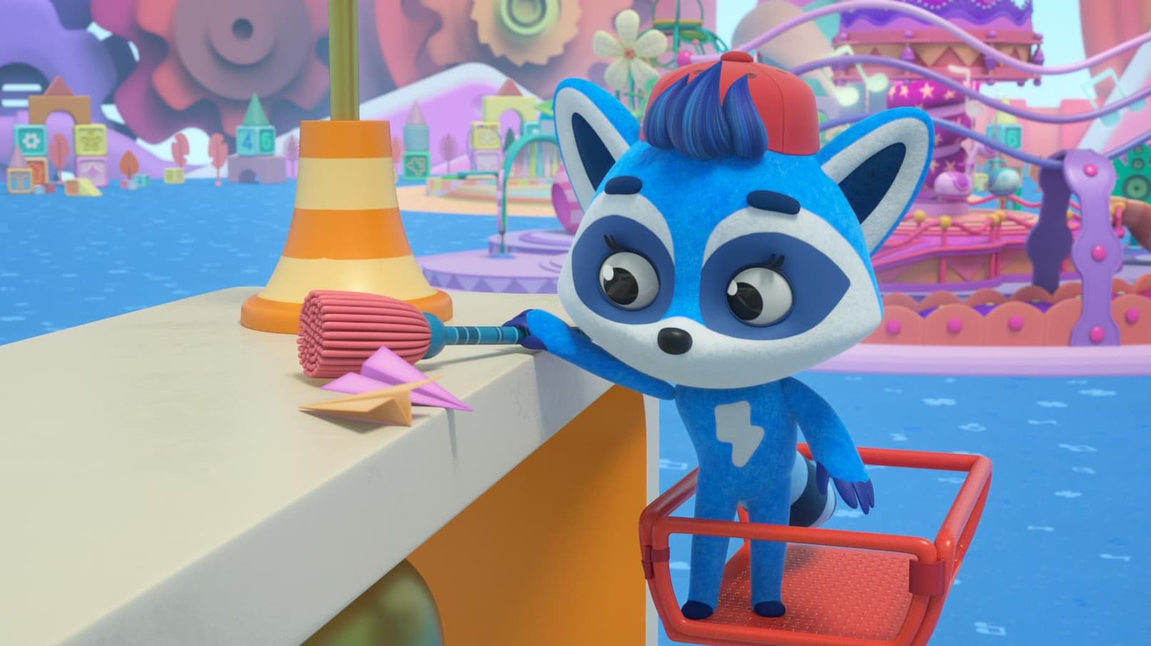 Baby Ti's paper plane gets stuck on a high arch. Doca wants to help Faf handle all of his cogs and nuts. Re shows Rockoons a striped paper plate. Rockoons play with cups.
