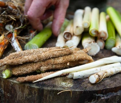 Les makes interesting and delicious foraging discoveries. Paul makes dinner.