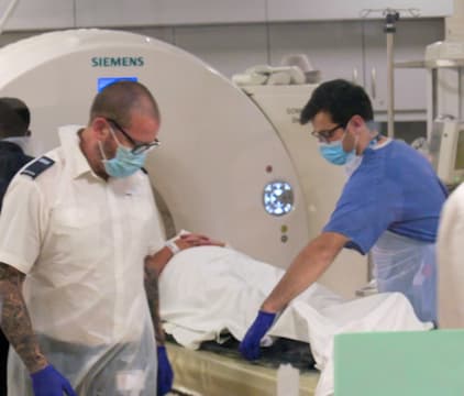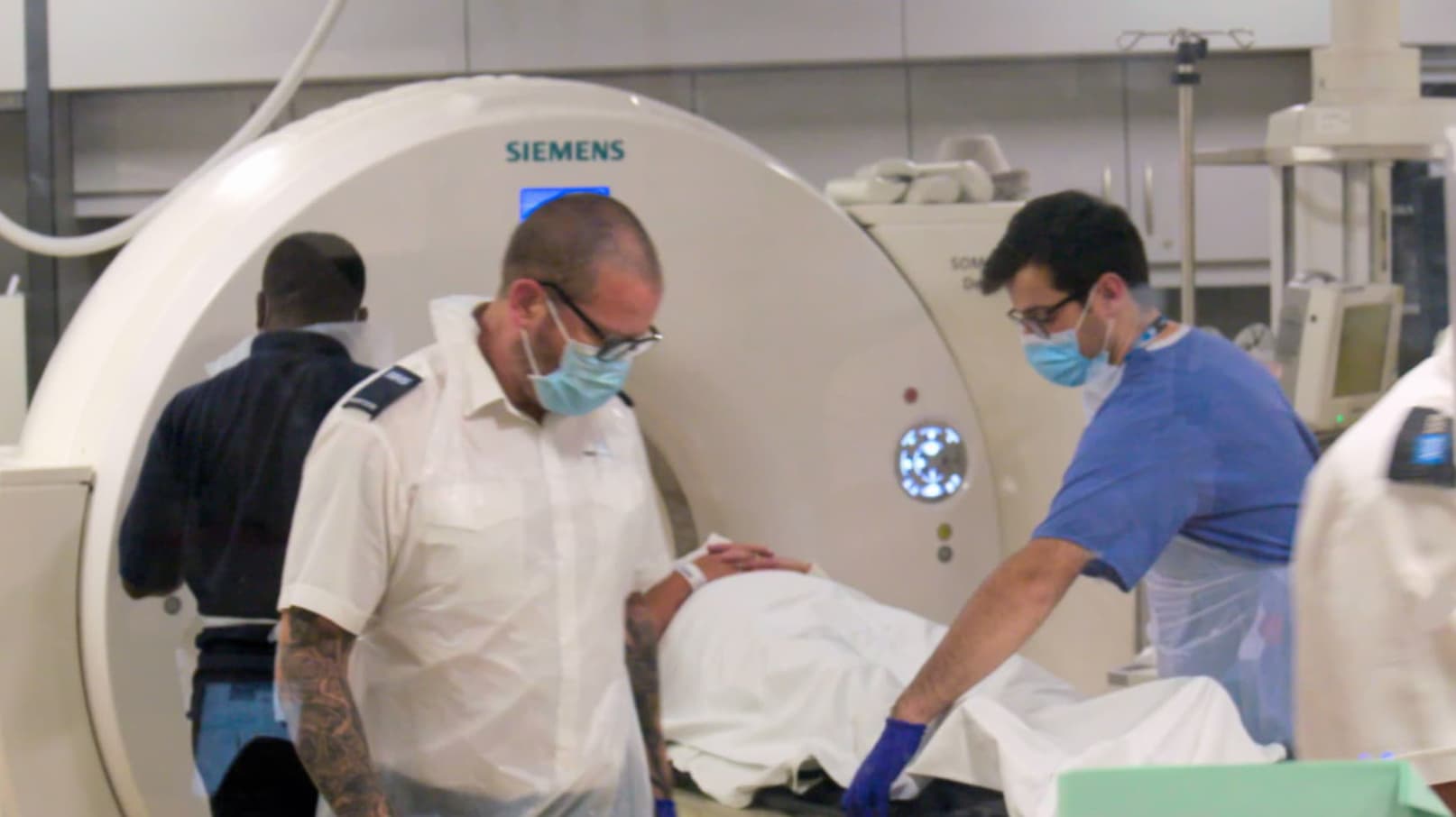 The A&E Department treats a man who fell through a glass window. A patient is escorted to the hospital by four police officers.