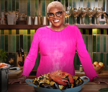 Chef Deborah VanTrece cooks a dish inspired by American meatloaf, blending the recipe with an English-style Wellington. She adds a Southern favorite, sorghum mustard, and prepares smothered potatoes to bring this global meal together.