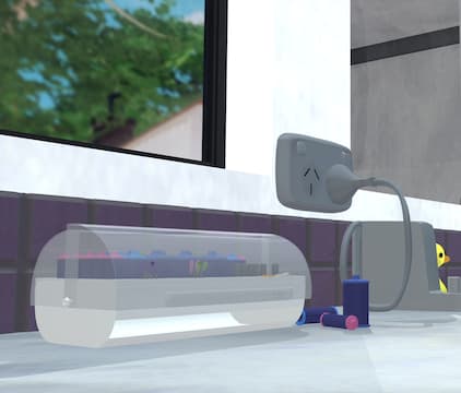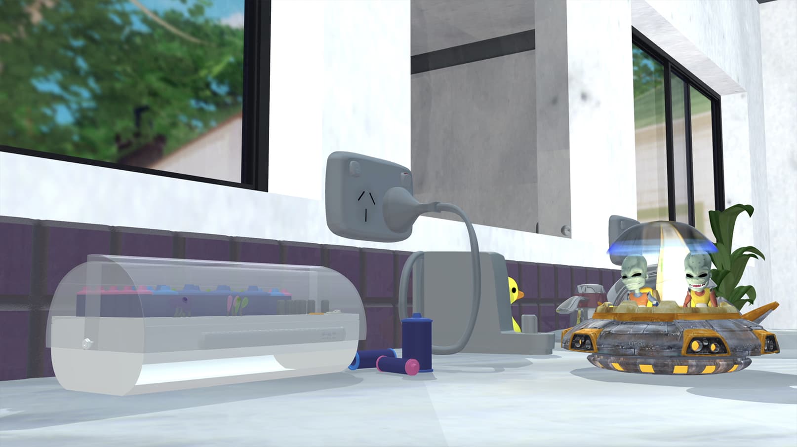 Two mischievous little aliens focus their insatiable curiosity toward various items in the bathroom. What could possibly go wrong?