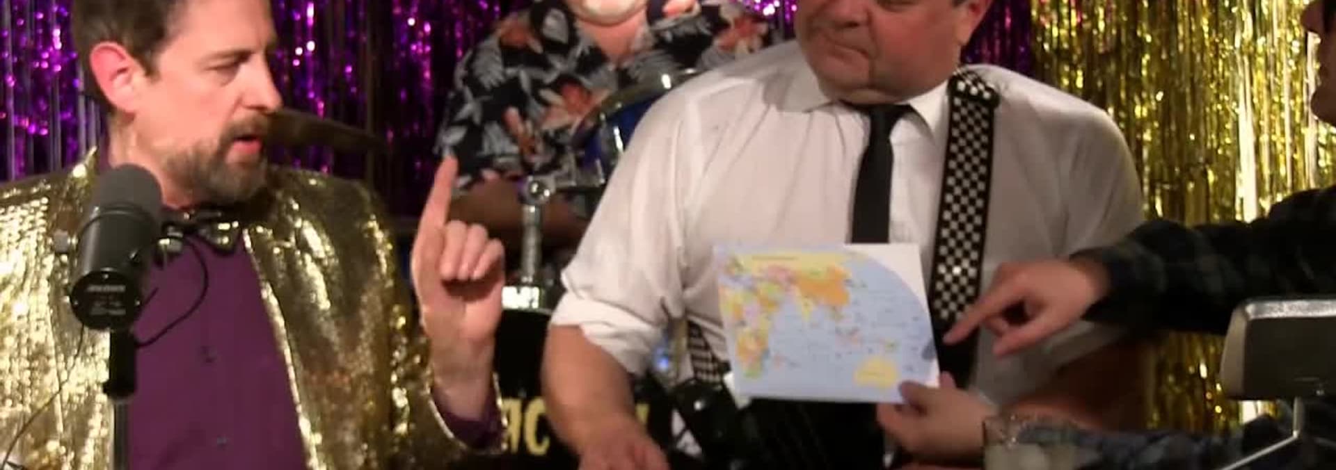 Bill shows off a framed photo of Drew Barrymore that is hanging above the C.B.S. bar. In this "international" show, the guest is Damien Reilly from Australia.
