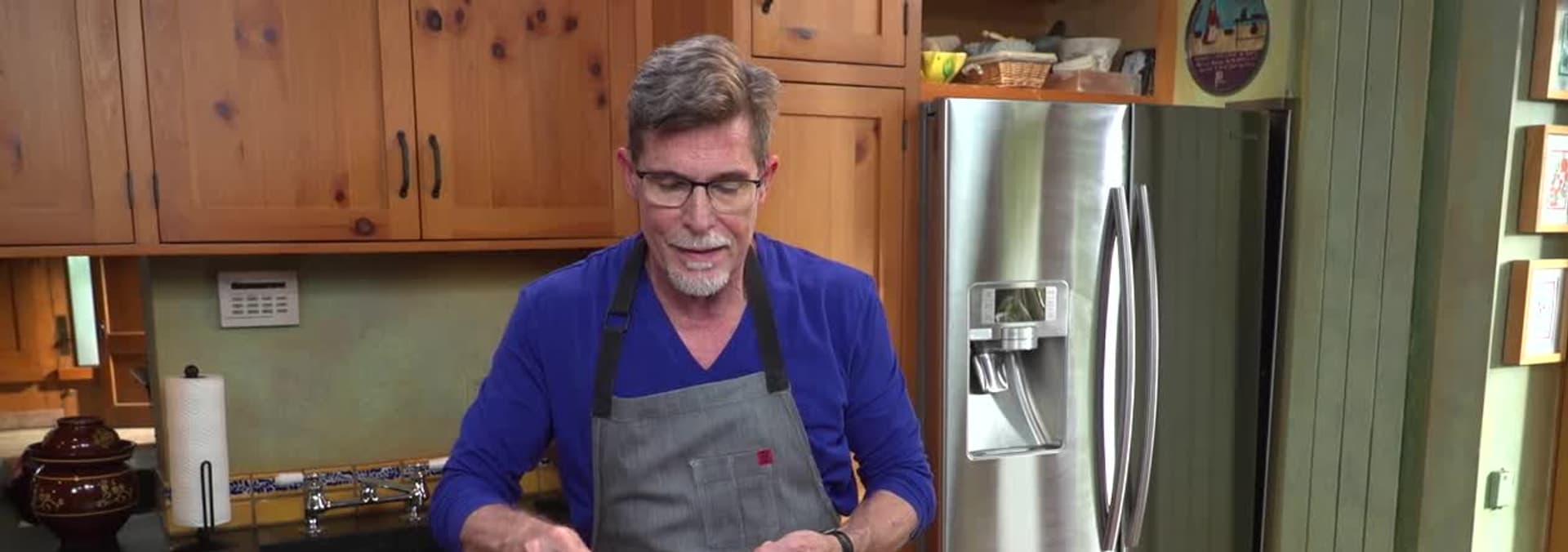 La receta de Rick comienza con el clásico chocolate caliente mexicano y termina con bocaditos de churro regados sobre helado de chocolate caliente mexicano.