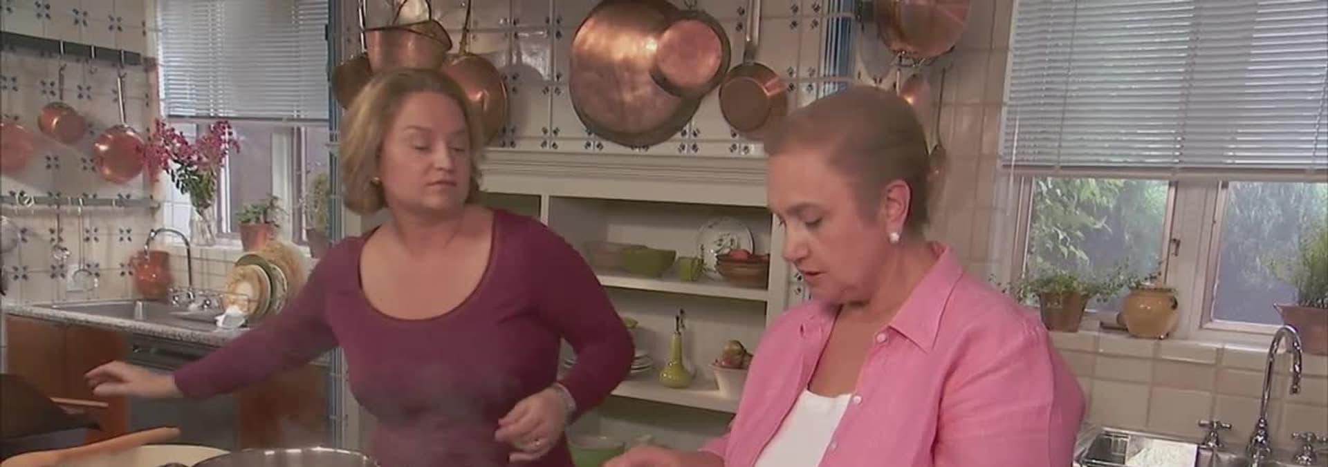Lidia makes an apple and bean soup, a refreshing country salad, apples and potatoes. For dessert, a bread pudding with chunks of apples and apricots.
