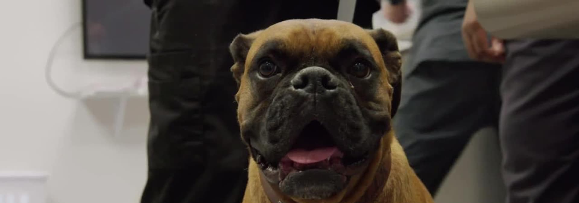 A bulldog has knee surgery, and a lamb has breathing problems.