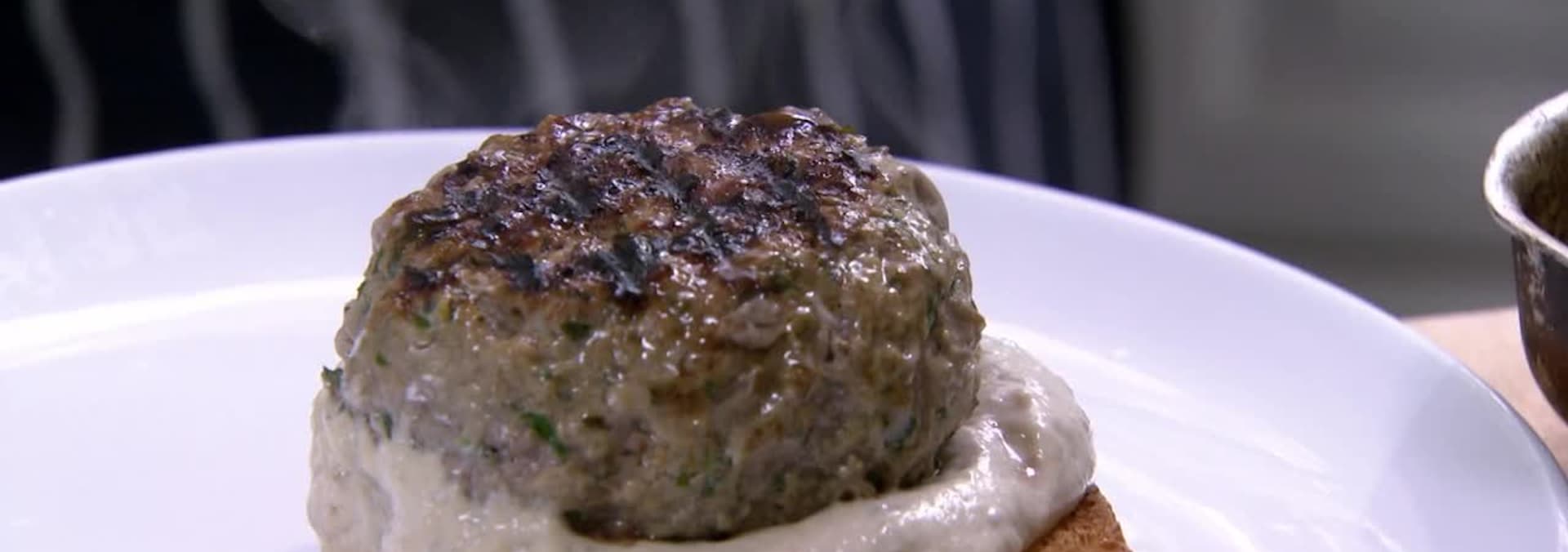 Chef Maria Elia cooks a supper to impress with dishes inspired by her travels - a vitello tonnato burger; porcini, fennel & crab salad and a dried fig leaf panna cotta