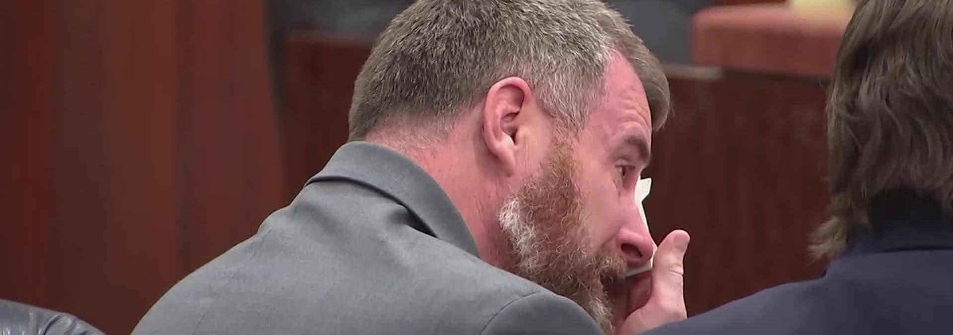 A tearful widow faces her late husband's killer; three bailiffs can barely contain an outraged defendant who must be taken out by force.