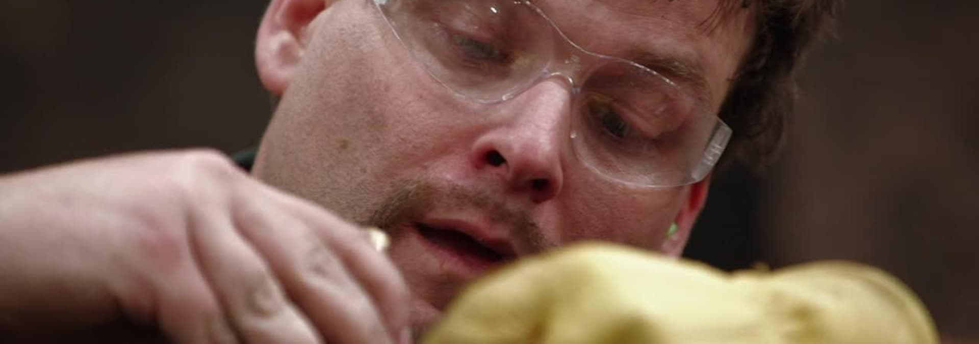 Four bladesmiths heat, hammer and grind their way through a first round challenge where they must transform a steel ball bearing into a fully functional weapon.