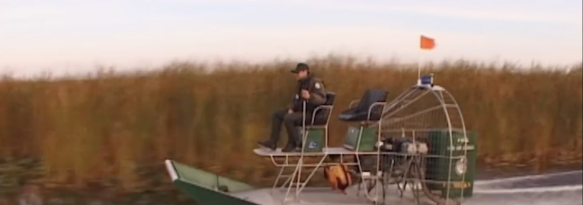 The Water Cops are aboard airboats, unique craft designed to drive on both water and land, patrolling the Everglades.