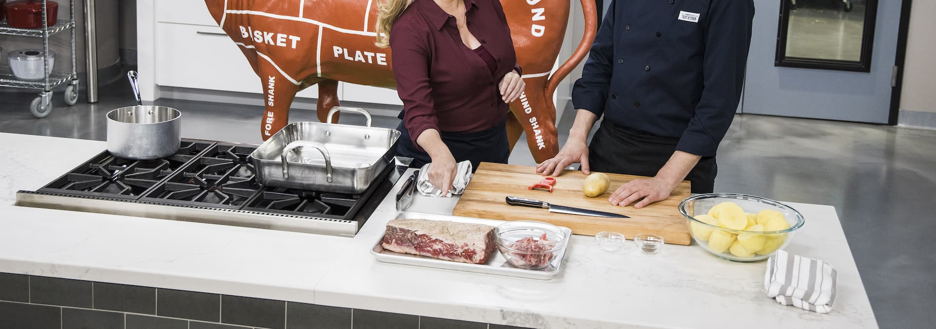 Test cook Dan Souza makes host Bridget Lancaster Beef Top Loin Roast with Potatoes.
