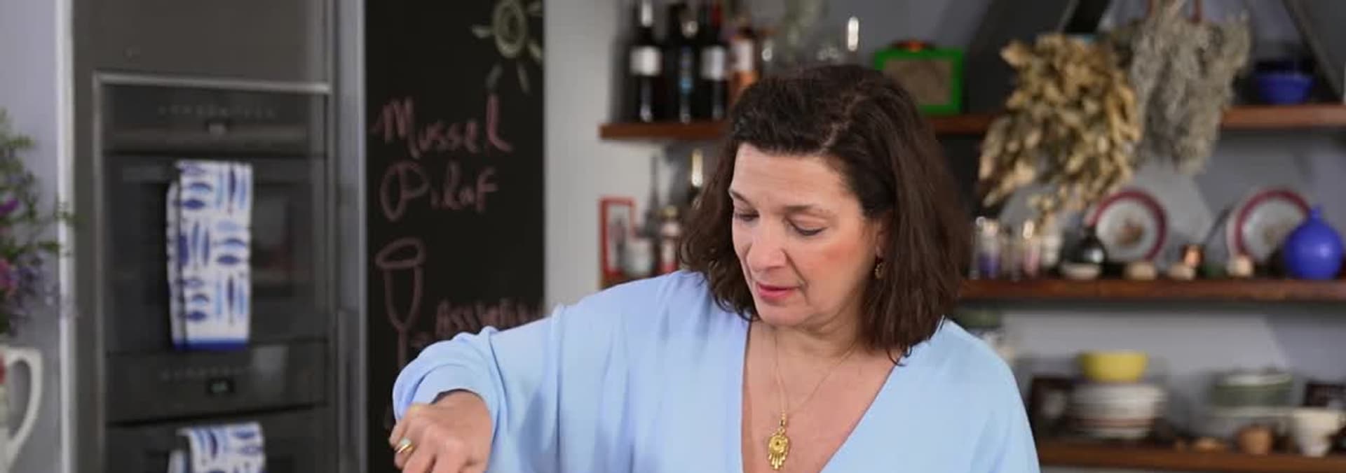 In Thessaloniki, Diane discovers bougatsa secrets and boards a mussel boat. In her kitchen, she cooks Feta-Stuffed Peppers and Mussel Pilaf.