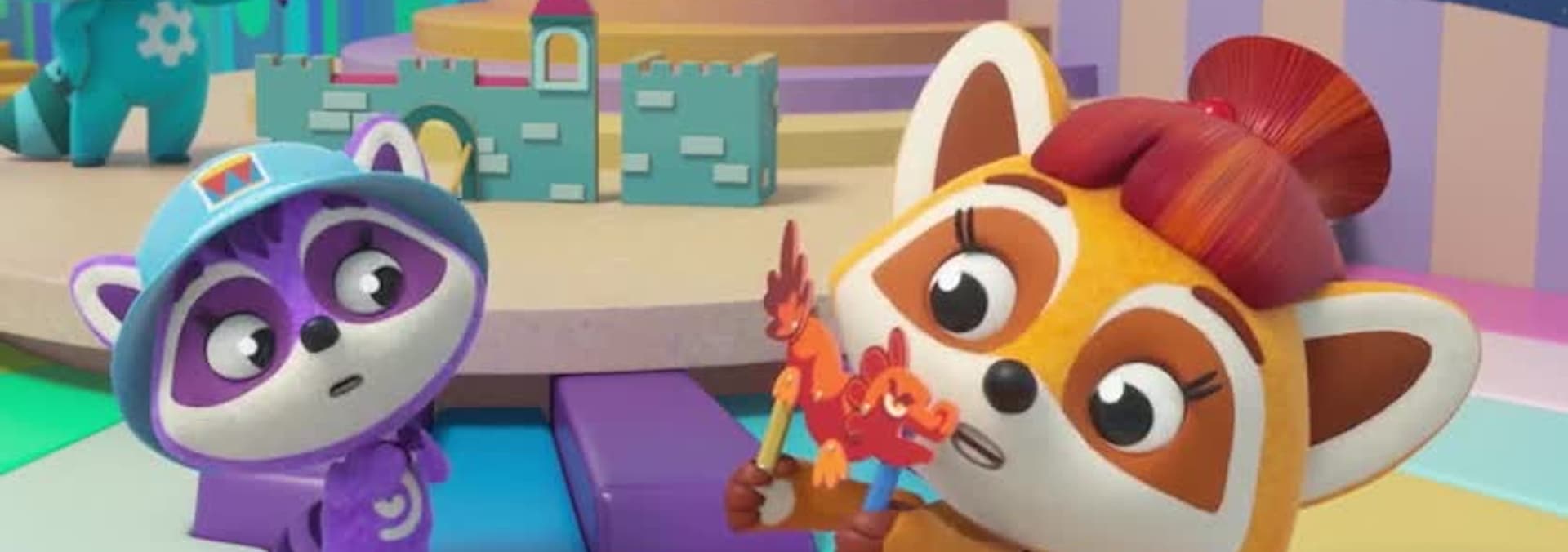 How do Rockoons clean up if the boxes' lids are gone? Rockoons play puppet theatre. Faf accidentally hits Re's construction set. Faf wants to hang his tools but the hooks are gone.
