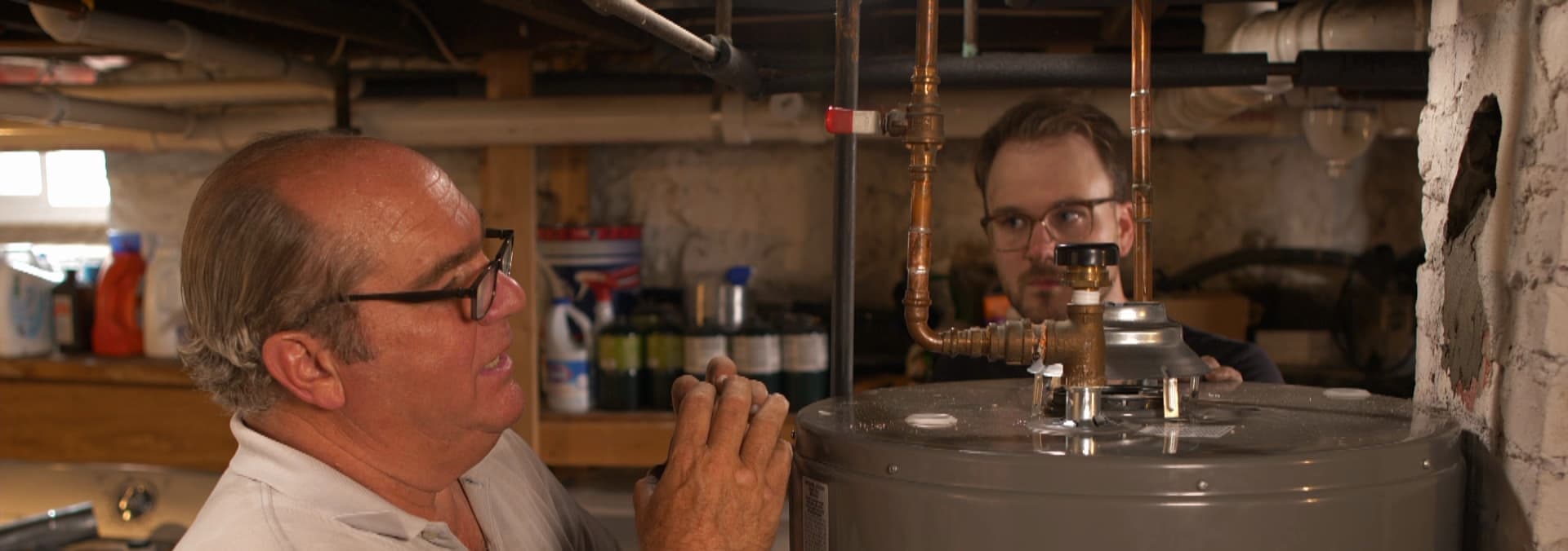 Richard replaces a water heater; Tom assesses woodpecker damage; Mauro paints tile.