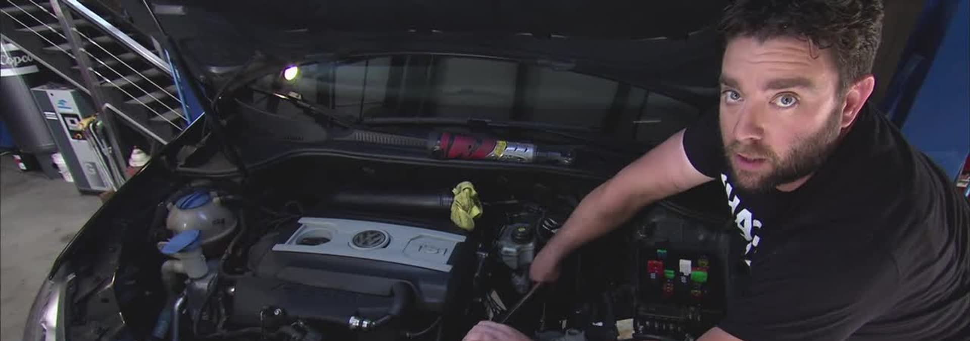 Jared and Lou work on a Volkswagen GTI with a burnt clutch.