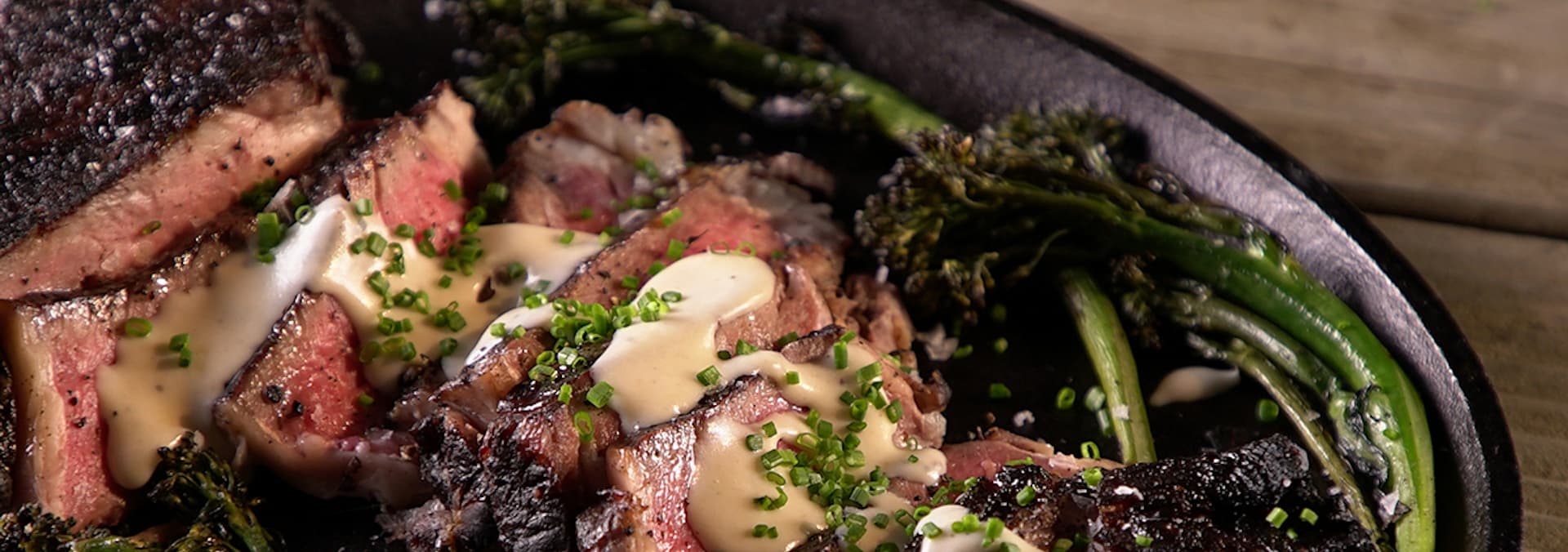 Grilled steak perfected with savvy techniques: dry-brined New York strip with anchovy crema, lamb with Moroccan Charmoula. Chef Curtis Stone grills aged rib steak.