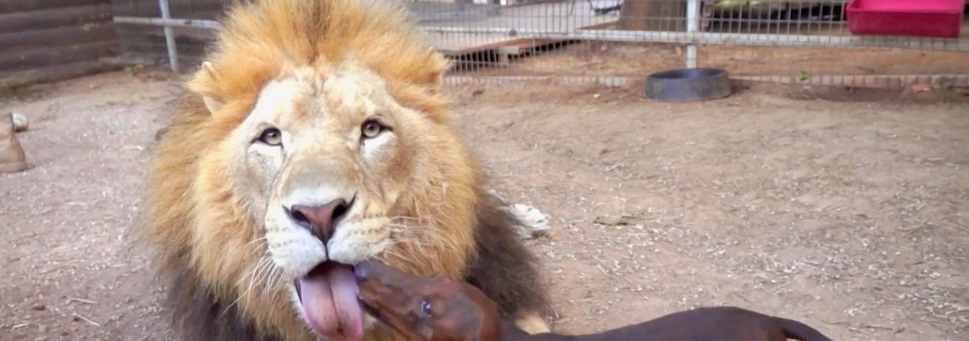 A feisty dachshund named Abby is the dearest friend of a Barbary lion named Bonedigger.
