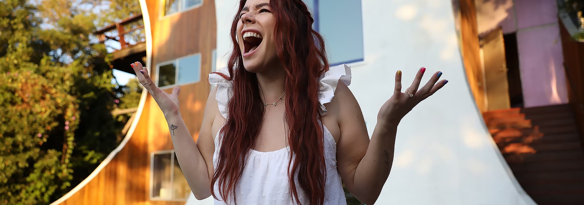 Jillian experiences a kaleidoscope of color exploring the Mosaic Tile House and the Rainbow House.