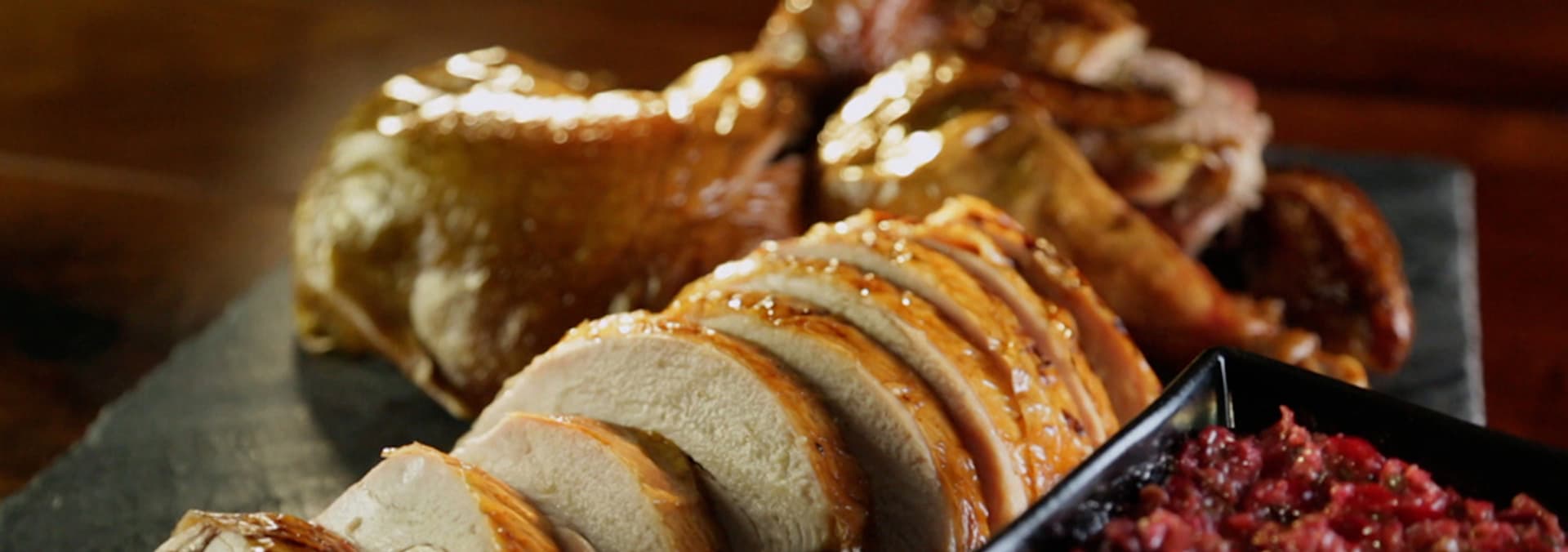 Whiskey-smoked turkey with cranberry salsa; barbecued onions; smoked creamed corn; bacon-apple crisp.