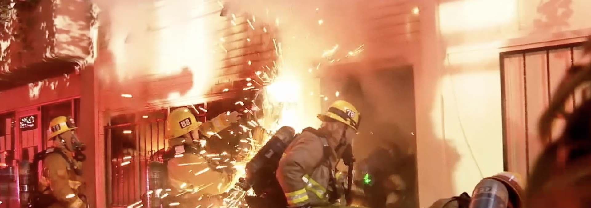 A routine building fire takes a terrifying turn as an explosion engulfs a group of firefighters in flames.