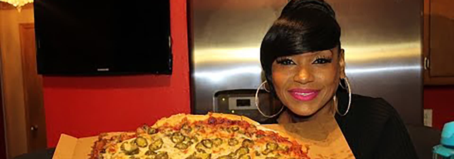 Blove's son joins her once again as they go in on a large cheesy pizza.