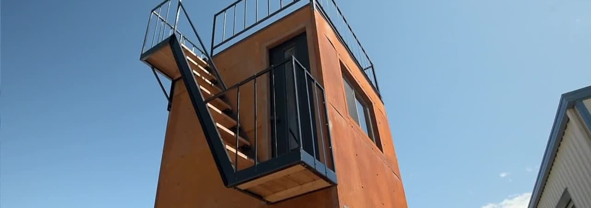 The team builds a towering tiny house with two stories and a rooftop deck.