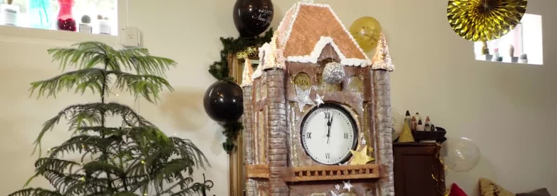 Brenda and Alisha design edible replicas of a clock tower and a cottage.