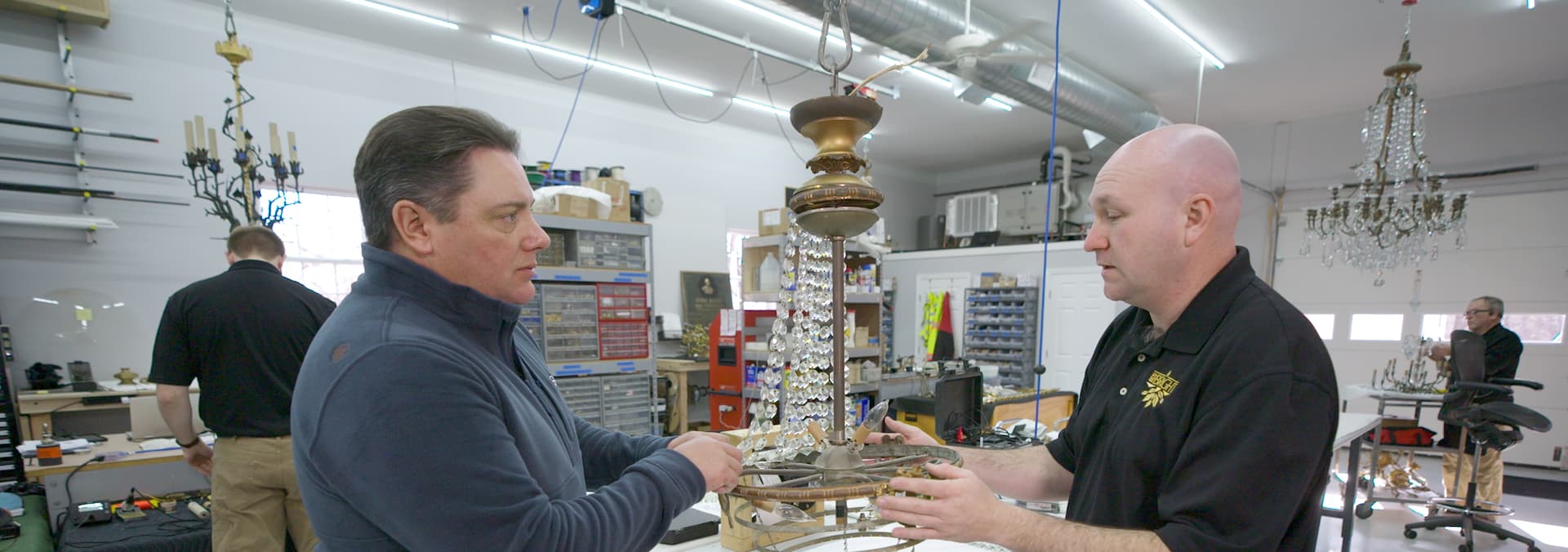 Heath visits Keith Cambell to check in on the rewiring of an antique chandelier.