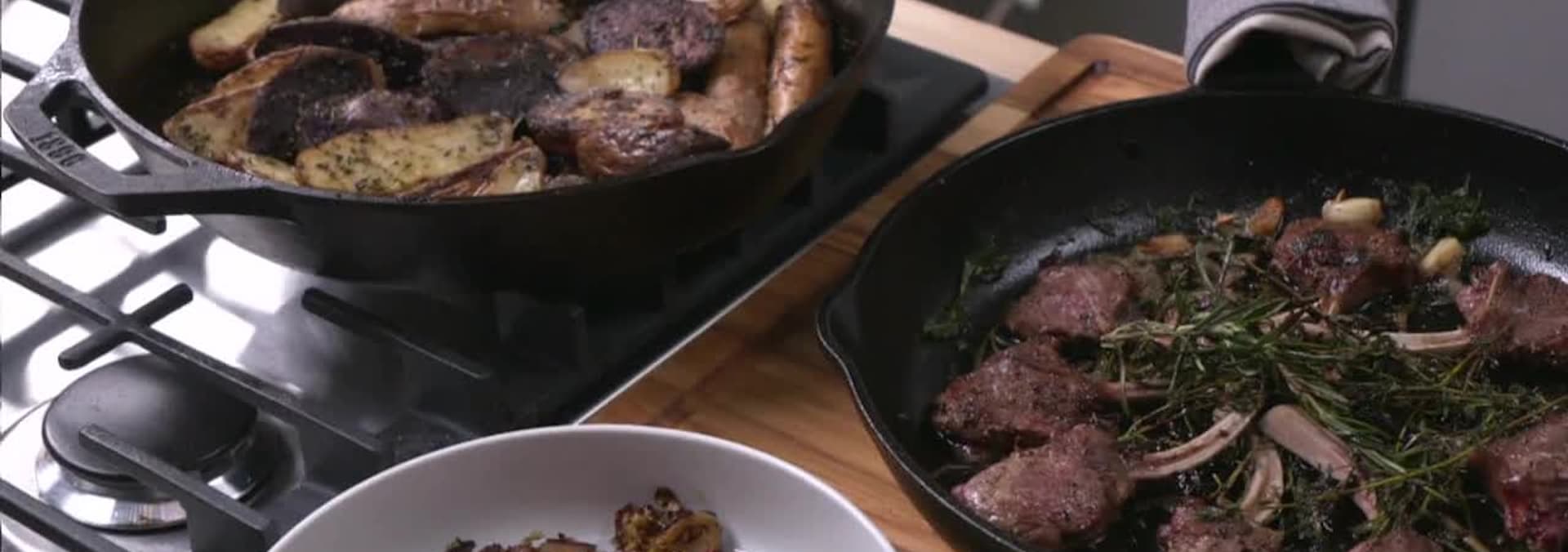 If meat and potatoes are your thing, have we got the recipes for you! Chef Jernard and Chef Reshacook up a hearty, and meaty meal that is simple and delicious. Jernard cooks up Rosemaryand Mint Lamb Chops with tender, crispy roasted Fingerling Potatoes, served alongside his Mapleand Balsamic Brussel Sprouts. Chef Resha makes a juicy Garlic & Herb Butter Steak, paired withRoasted Sweet Potatoes and Savory Cider Caramel. Its a meat and potato turn-up thats a mealtimegame changer.