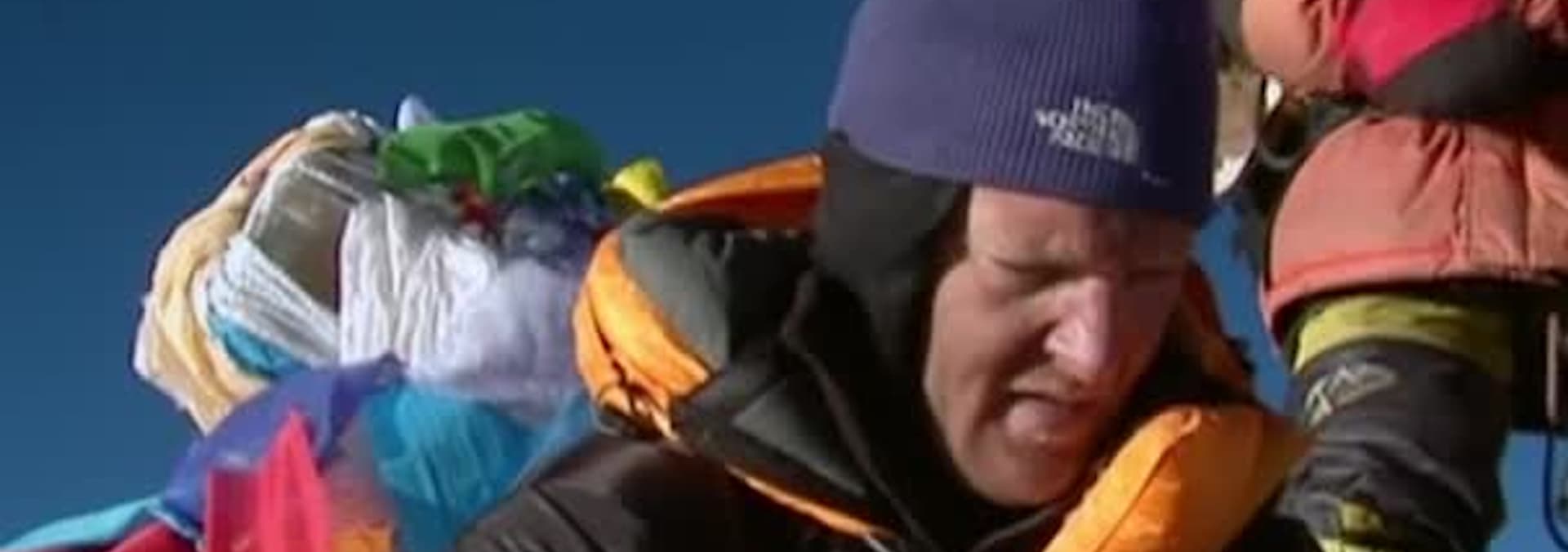 On his way to the summit, Tim falls and snaps two bones in his hand.