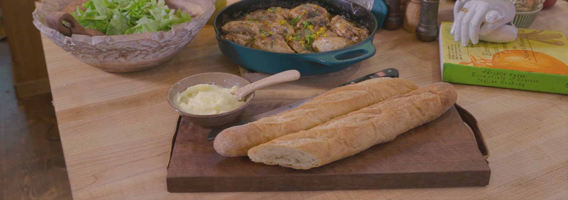 A French-country inspired tangy, creamy chicken dinner with vinegar and tarragon, served alongside a simple salad and baguette with soft butter.