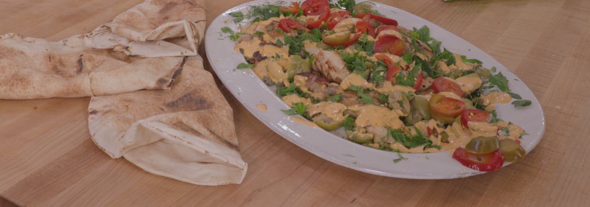 Season 1 Episode 15 - Charred Mediterranean Chicken Salad With Olives and Tahini Yogurt Sauce