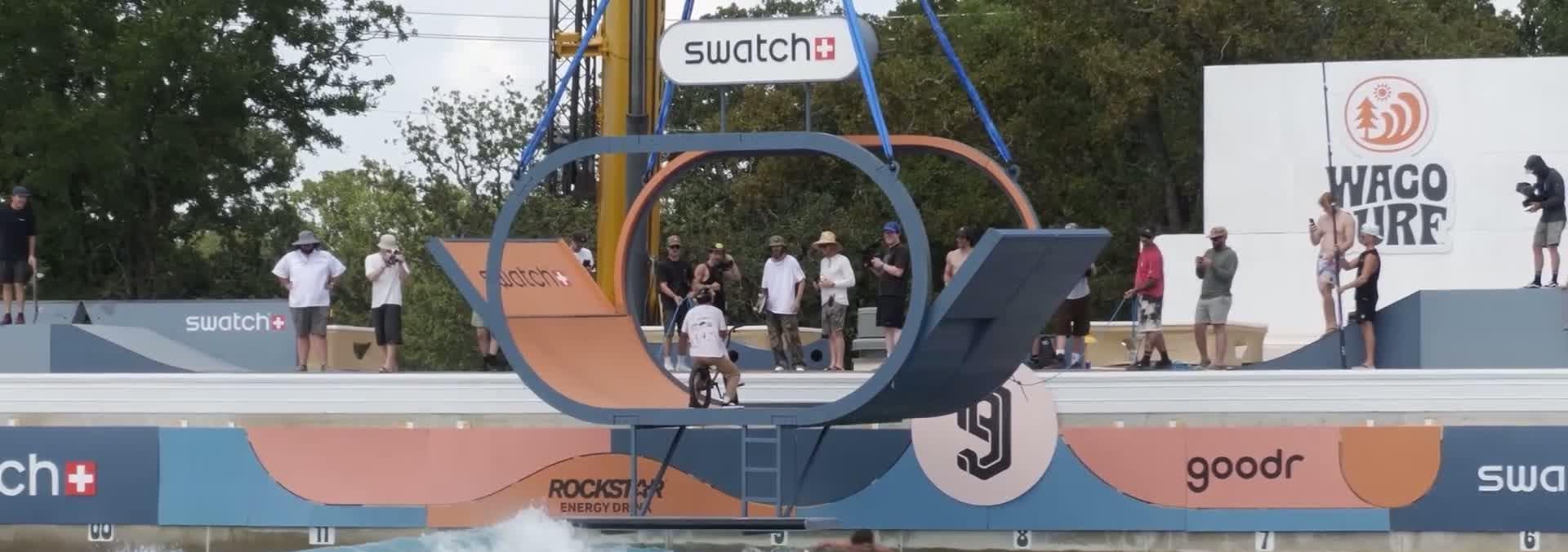 The SkidKids Day 1 of the Swatch Nines Surf event was an absolute circus where surf, skate, and BMX collide. some of the best athletes in all sports come together to ride features that are assemble around a wavepool in the middle of Texas.