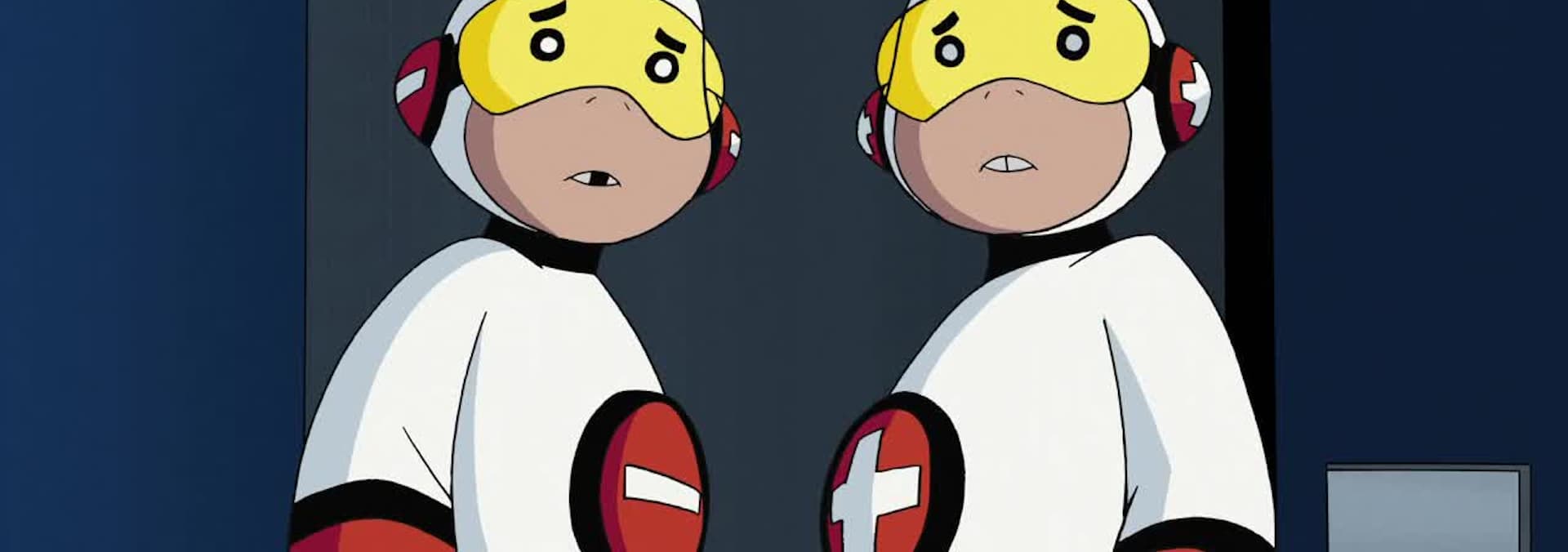 In part one of the two-part finale, Cyborg has a final showdown with Brother Blood, and a new branch of the Titans team is created. Titans East is a different tower in a new city with five new members: Aqualad, Bumblebee, Speedy and a pair of high-speed twins known as Mas Y Menos.Part one of a two-part episode.