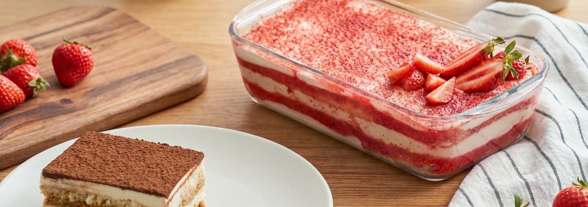 Two gentle tiramisu desserts: classic coffee tiramisu and fresh strawberry tiramisu, made slowly and quietly.