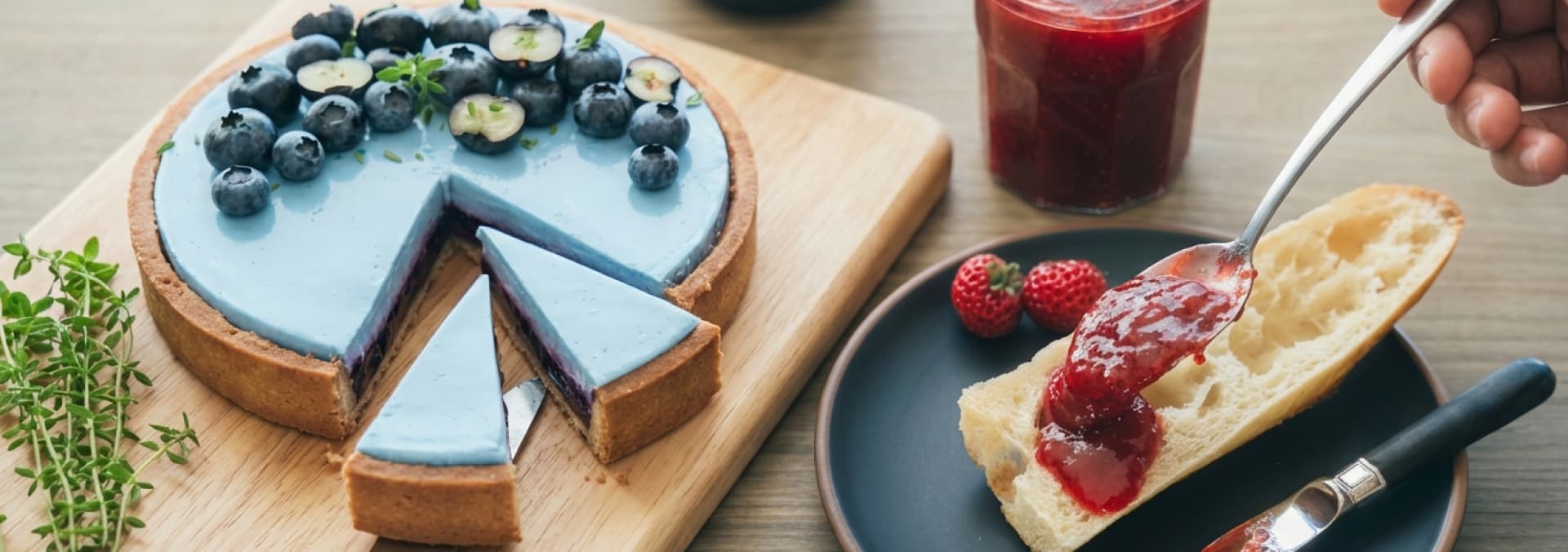 Soft, colorful, and sweet - strawberry jam and sky blue tart in one gentle dessert compilation.
