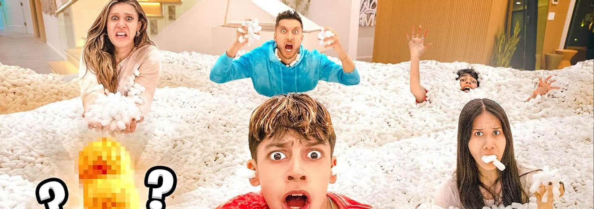 The Royalty Family searches a pool of packing peanuts for a Ritz cracker and then plays hide-and-seek at an Amazon store.