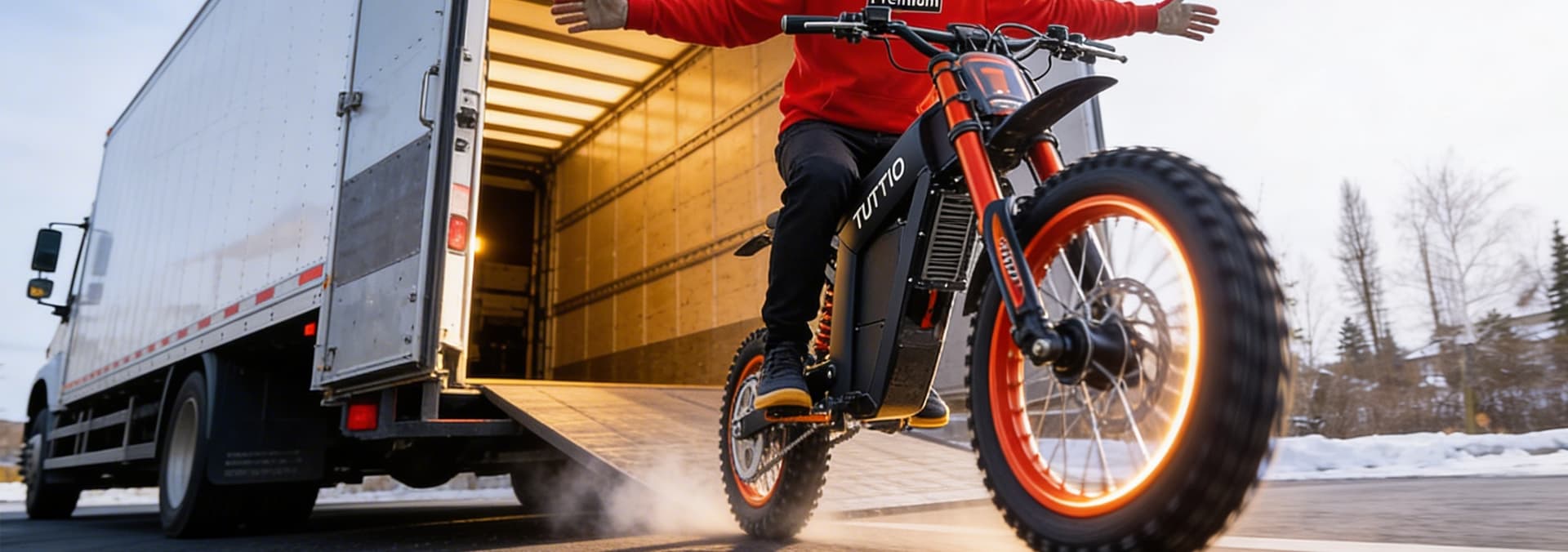 A child’s dirt bike is upgraded for ice riding with new forks, swingarm extensions, and studded tires, then tested on a frozen lake.