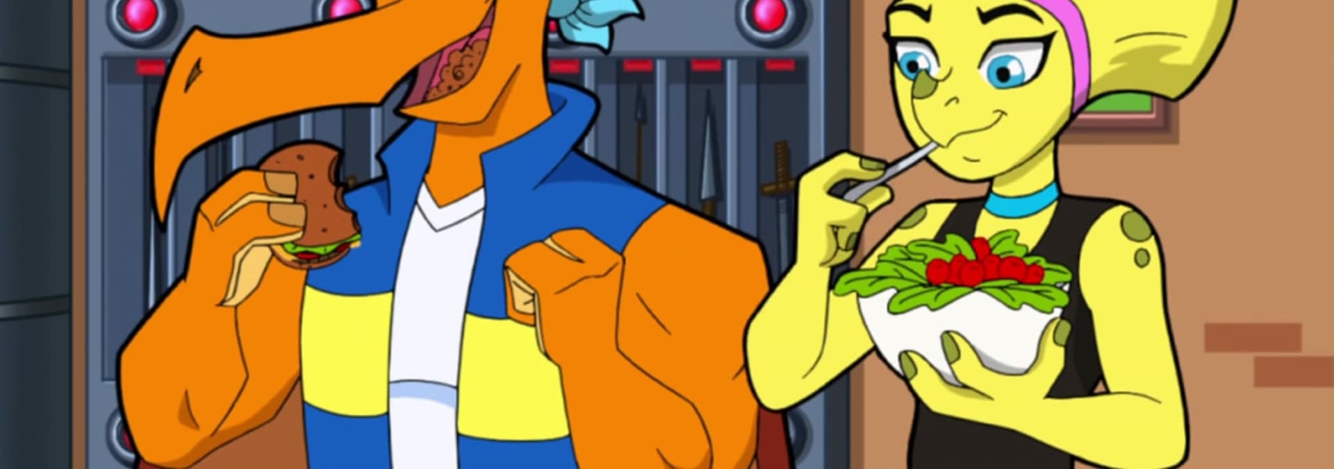 As the KFDP headquarters becomes more modernized (with workout equipment and energy drinks and such ), Kane feels like hes losing touch with his dino roots. So he announces to the others that hes moving out into a rustic cave on the outskirts of town just like back in the good old prehistoric days. As the other dinos plead with Kane to reconsider We see Skor and Skrap.