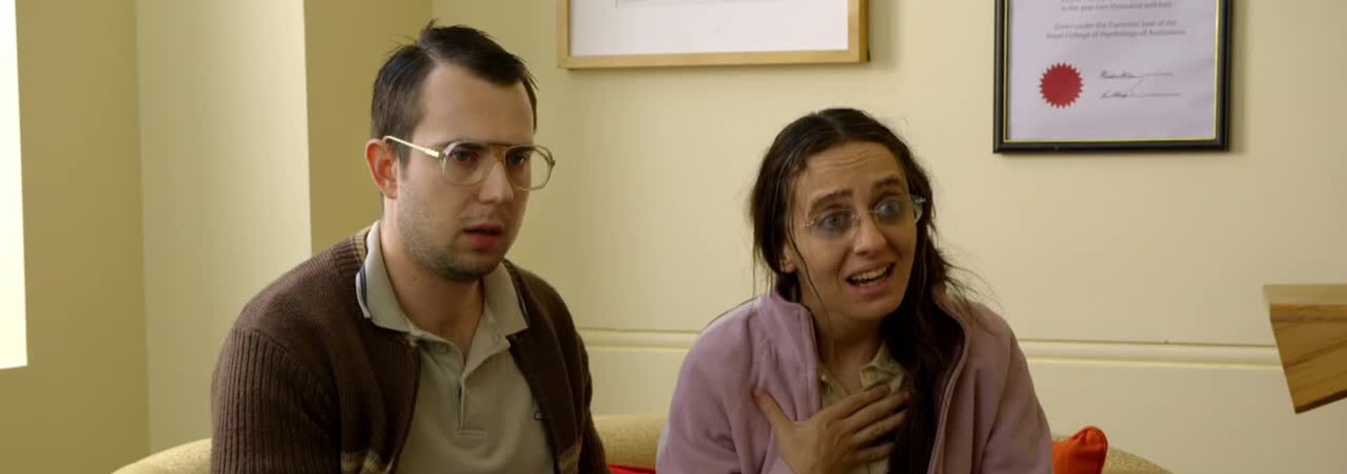 Tahina the narcissistic receptionist cheerfully crushes the confidence of a young man eager to ask her out. Disco is outraged when he gets a parking fine while using his mum's car. Scottish couple Helen and Malcolm attend couple's counseling.