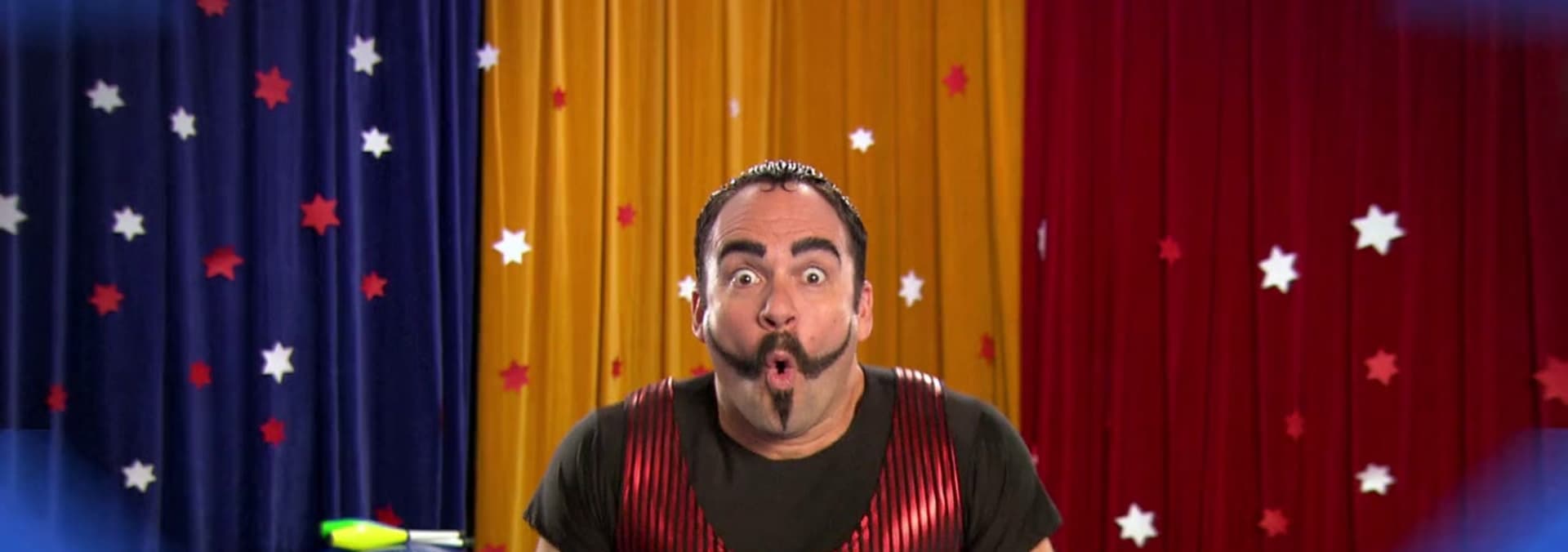 While the circus artists are dancing to some music they hear a noise, it is the circus children stretching! The circus artists want to do the splits and some stretching, but when they try they keep falling over