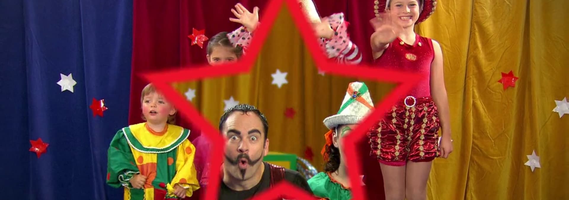 While the circus artists are dancing to some music they hear a noise, it is the circus children stretching! The circus artists want to do the splits and some stretching, but when they try they keep falling over