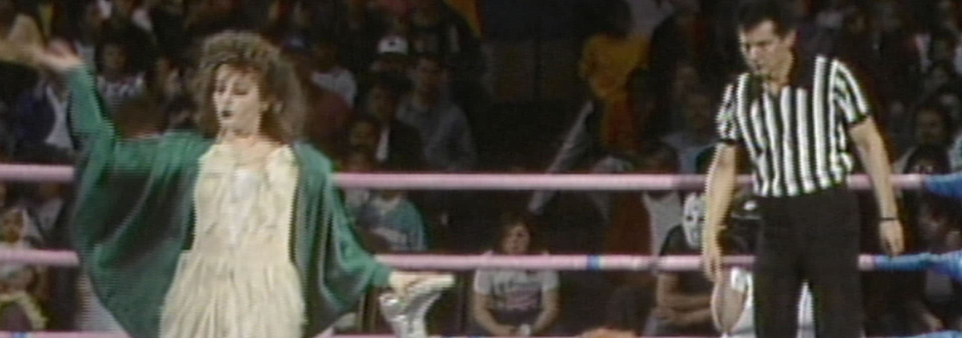 Cheerleading sensation and newcomer Vicky Victory hopes to snag the title from Ninotchka in tonight's main event. Sunny the California Girl fights Daisy and Gremlina, and Mt. Fiji erupts upon Beastie and Habana, with no referee present to curb the chaos. Roxy Astor evades Dementia's axe, and the Country Girls Sally and Babe team up against Godiva and Hollywood.