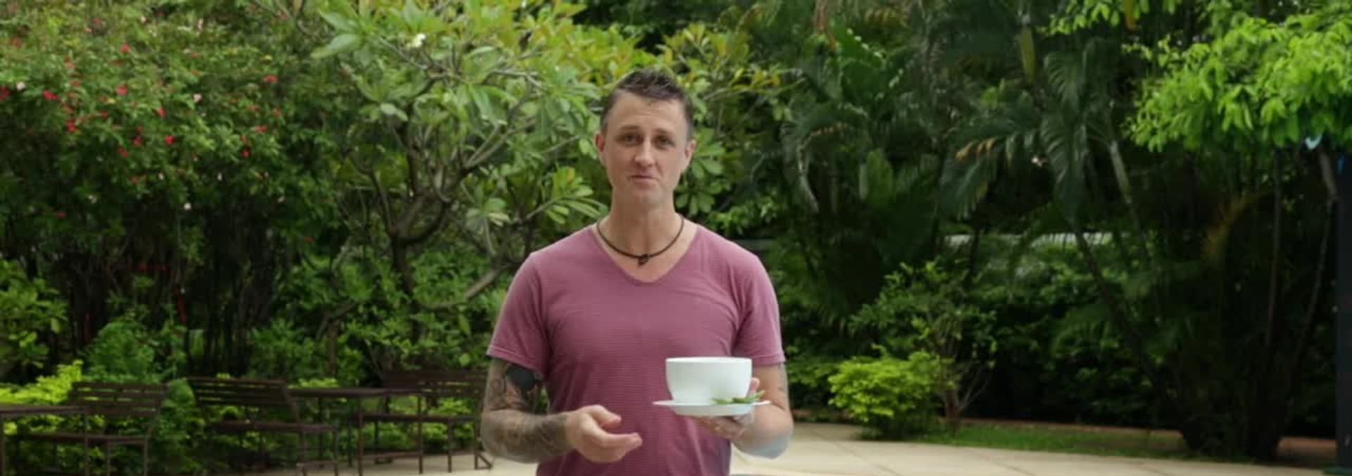 Duncan picks Blue butterfly pea from an Organic farm in the rainforest before cooking steamed fish in coconut under a tropical canopy.
