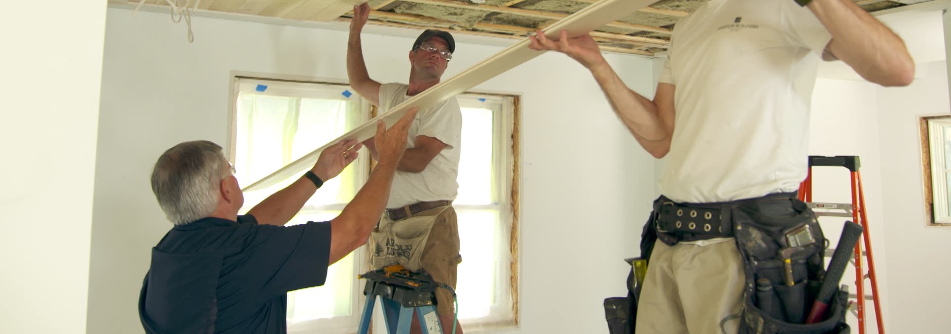 Hanging blue board vs hanging drywall. Richard sizes a solar array. Jeff and Tommy install a wood ceiling. A generator is installed at the Idea House. Richard visits a boat building school.