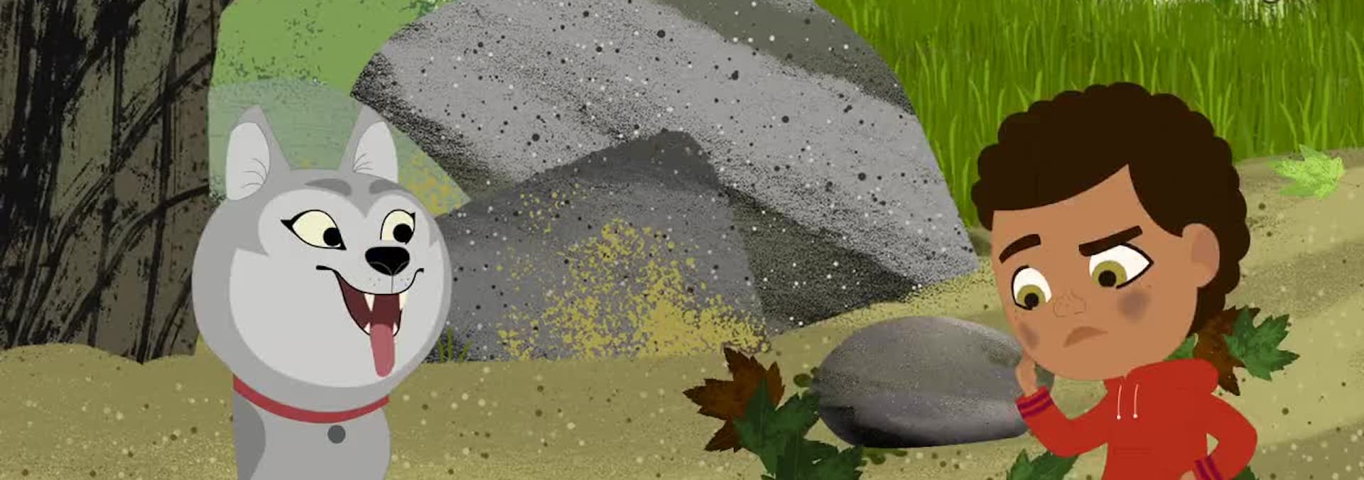 Looking closely at the ground near a rock, Rider and Wolfie find a family of roly poly bugs. Rider tries to roll up just like them!