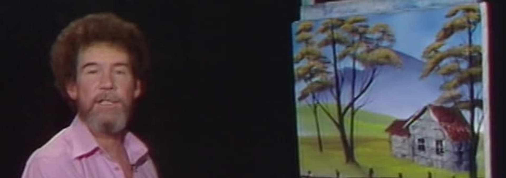 A weathered fence guards a rustic country home shadowed by tall trees as Bob Ross creates another masterpiece in his unique style.